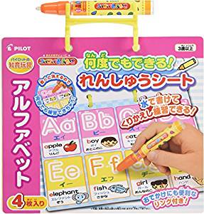 れんしゅうシートをなぞりながら、アルファベットを書く練習が出来ます。乾かせば何度でも練習できるのが嬉しいですね。水を利用するので、手や服を汚すことはありません。