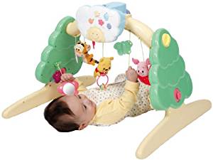 こちらのベビージムは、何と2歳まで長く使える優れもの!布製のマットは、折り紙の要領で「てあそびいっぱいボックス」に変身できるため、成長後も十分楽しめます。大きなプーさんのマスコットも、子ども達に大人気!
