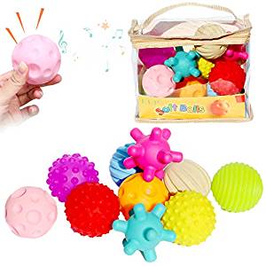 柔らかな形状のボールが10個も入っているお得なセット。沢山の形に触れることができ、押すと音も楽しめます。