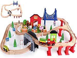 本格的な木製電車おもちゃ。カラフルでおしゃれな色使いは、インテリアにもマッチしそうですね。草や木、駅やベンチなど、レイアウトを彩るパーツが沢山付いているのも魅力的です!