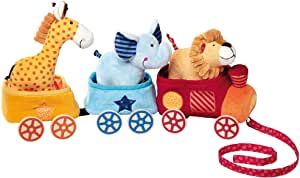赤ちゃんにおすすめの電車おもちゃ。ぬいぐるみが乗った電車をママパパが引っ張ってあげると、ズリバイやハイハイで一生懸命追いかけます。木製の車輪が付いているので、スムーズに動かすことができますよ。